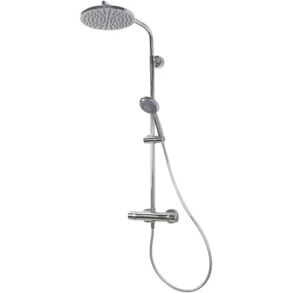 Das Breuer Brauseset Aquamaxx 310 in runder Form mit Thermostat ist in einem edlen Design gehalten und überzeugt zudem mit Vielseitigkeit und Funktionalität. Dank der höhenverstellbaren Eigenschaften und der Klebetechnologie lässt sich das Set in nahezu jedem Badezimmer installieren.
