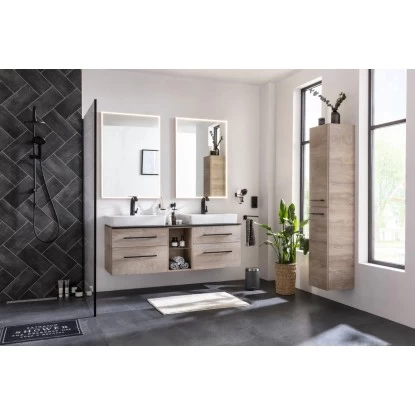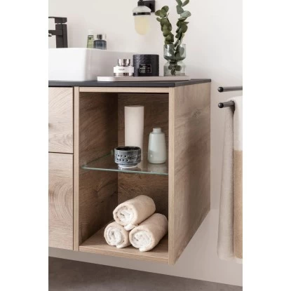 Spitzenmaterialien und eine edle Optik eröffnen neue Wege, um mit dem hängenden Fackelmann Regal unten aus der Serie Oxford seinen eigenen Badezimmer-Stil zu verwirklichen. Als Möbeldekore stehen das markante Nature Oak und das klassische Weiß zur Auswahl. Das Regal ist mit einem Glaseinlegeboden ausgestattet, die zwei Fächer ergeben, welche viel Stauraum für alle notwendigen Badutensilien gewähren. Des Weiteren weist dieses Regal eine hochwertig verarbeitete Dickkante mit wasserfester, quellsicherer Verleimung auf. Korpus und Front sind aus feuchtigkeitsresistenten Materialien gefertigt, stabil und pflegeleicht.