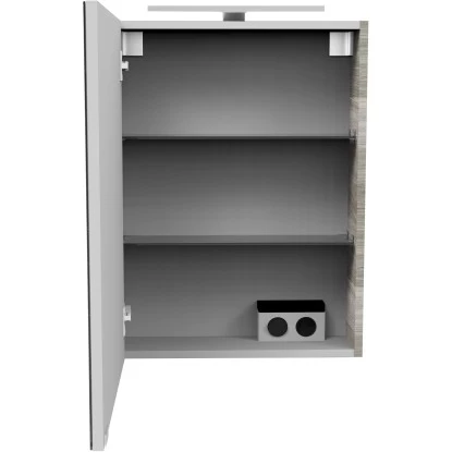Immer mehr fungiert das Gästebad als Visitenkarte des persönlichen Einrichtungsstils. Der Fackelmann Spiegelschrank ist Teil der Small Bathroom Collection (SBC), mit der Fackelmann sein bewährtes Konzept für die Vielfalt und das elegante Ambiente im Gästebad neu überdacht und optimiert hat. Der hängend montierte Spiegelschrank begeistert mit zahlreichen ansprechenden Korpus- und Frontvarianten, die von Weiß über Anthrazit bis hin zu diversen Holzdekoren reichen. Die Beleuchtung des Spiegelschranks mit eingebauter LED-Aufsatzleuchte steuert eine Elektrobox mit Schalter und Steckdose. Die Tür links lässt sich ohne Griff öffnen. Im Inneren ist der Spiegelschrank mit 2 Glasablageböden ausgestattet, die 3 Fächer ergeben, welche viel Stauraum für alle notwendigen Badutensilien gewähren.
