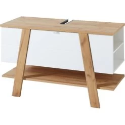 Mit diesem Waschbeckenunterschrank schwappt eine Welle der Entspannung in Ihr Badezimmer. Formschöne Möbel sorgen hier für ein zeitloses und modernes Auftreten. Das liegt auch an der Farbkombination aus Fronten in supermattem Weiß und Akzenten in Navarra-Eiche-Nb., die den Möbeln einen skandinavischen Look verleihen. Dieser strahlt eine große Portion Wärme und Gemütlichkeit aus – genau das richtige für die Wellness-Oase in den eigenen vier Wänden.