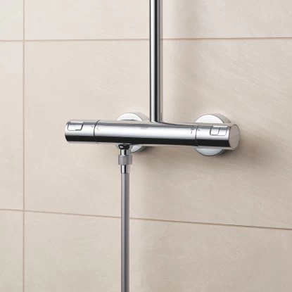 Das Grohe QuickFix Duschsystem Vitalio Start 250 verbindet Stil, Eleganz und Vielseitigkeit. Die Brausegarnitur wird mit einer Aufputz-Thermostatbatterie geliefert. Das Duschsystem ist für die Wandmontage konzipiert und für Durchlauferhitzer ab 18 kWh geeignet.