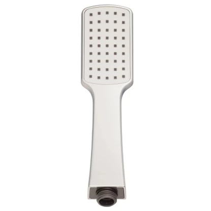 Die Handbrause aus der Serie My Rain hat eine schlichte, eckige Form und eine einfache Strahlart. Die Brause ist aus Kunststoff und hat eine verchromte Oberfläche. Die Innenfläche des Brausekopfs ist Weiß.