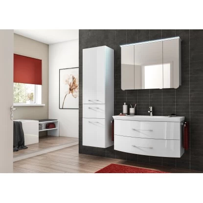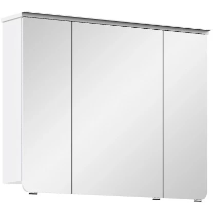 Der Spiegelschrank ist ein Highlight des Badmöbel-Sets Quantum 01. Er ist sehr breit (90 cm) und besitzt drei Spiegeltüren. Außerdem verfügt er über eine LED-Beleuchtung, wodurch er immer optimal ausgeleuchtet ist. Der Spiegelschrank enthält eingebaute Lampen der Energieklasse (EEK) A bis A++. Durch die sechs Glas-Einlegeböden bietet der Spiegelschrank zudem weiteren praktischen Stauraum.