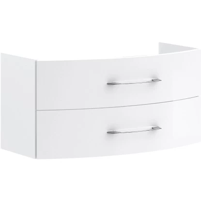 Das Waschbecken ist in einen praktischen Unterschrank integriert. Dieser Waschbeckenunterschrank in schickem Weiß verfügt über zwei Schubkästen. Die Schubladen sind mit Soft Close-Systemen für gedämpftes Schließen ausgestattet. Eine spezielle Folie sorgt dafür, dass der Eindruck einer Lackoberfläche entsteht. Durch die Folie außen auf dem Unterschrank und die Melamin-Beschichtung im Innern ist der Unterschrank leicht zu reinigen und resistenter gegen Feuchtigkeit. Die Griffe des Waschbeckenunterschranks sind in glänzendem Chrom gestaltet.