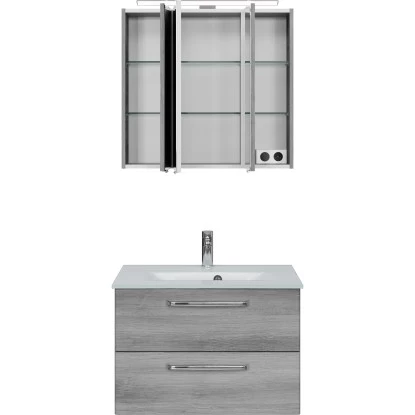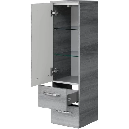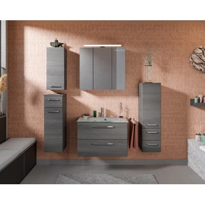 Das Pelipal Badmöbel-Set TrenTino mit Beimöbeln und Glaswaschtisch 137 cm Graphit bietet eine elementare, bestehend aus den drei Kernkomponenten Waschtisch, Waschtischunterschrank Spiegelschrank und als Beimöbel ein Unterschrank und ein Midischrank. Prädestiniert ist TrenTino für die individuelle kleinerer Bäder. Bad-Set bestehend aus