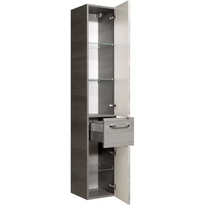 Für alle, die viele Pflegeprodukte haben, ist der Hochschrank Quantum 5 bestens geeignet. Hier in modernem Graphit-Dekor.