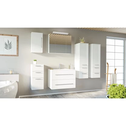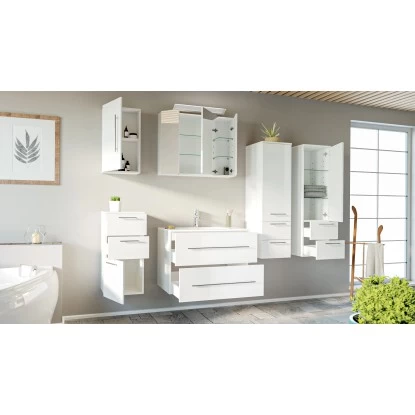 Das 6-teilige Posseik Badmöbel-Set Homeline überzeugt durch das moderne und edle Design in glänzendem Weiß. Die matt gebürsteten Edelstahl-Griffe runden das schöne und schlichte Gesamtbild optimal ab. Mit diesen Badmöbeln sorgen Sie für ein absolutes Highlight in Ihrem Bad. Das Set verbindet gekonnt dezente Eleganz mit praktischen Eigenschaften. Für ein bemerkenswertes Qualitätsmerkmal sprechen die weichen abgerundeten Kanten und Ecken sowie das Soft-Close-System, wodurch das geräuschlose Schließen der Schubladen und Türen garantiert wird.