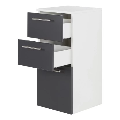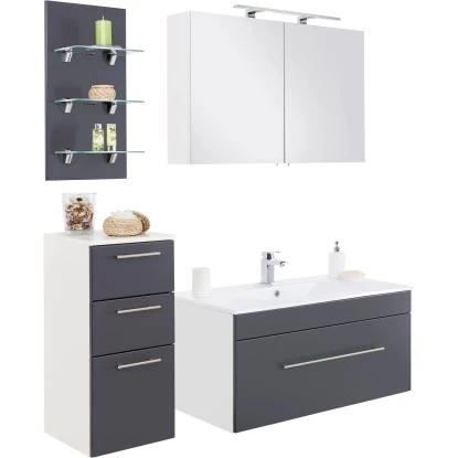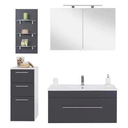 Das Badmöbel-Set Viva zeichnet sich durch modernes Design und hochwertige Qualität aus. Die Serie ist in verschiedenen Farben erhältlich und bietet tolle Kombinationsmöglichkeiten. Das formschöne Keramikwaschbecken ist pflegeleicht und wird einfach auf den Waschbeckenunterschrank aufgesetzt. Die Fronten der Möbel sind auch über die Kanten und Ecken mit einer hochwertigen Beschichtung versehen. Die weichen Kanten verleihen dieser Möbelserie eine schöne 3D-Optik. Der Korpus ist in Weiß matt gehalten während für die Fronten sowohl die Farben Weiß Hochglanz, Schwarz und Anthrazit als auch eine edle Betonoptik zur Auswahl stehen. Die Schubladen und ggf. Türen schließen mit der bequemen Soft-Close-Funktion und ziehen sich selbstständig auf den letzten Zentimetern sanft ein.
