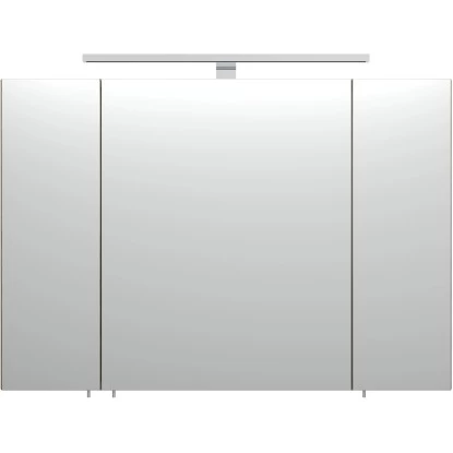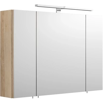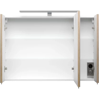 Der 3-türige Spiegelschrank bietet durch seine Breite von 90 Zentimetern optimalen Stauraum, welcher nicht zuletzt durch die sechs variabel einsetzbaren Glaseinlegeböden ermöglicht wird. Zudem besitzt er eine Schalter-Stecker Kombination und eine chromfarbene LED-Lampe. Diese bietet Ihnen 8 Watt und 600 lm (Lichtfarbe: Neutralweiß). Der Schrank ist modern und gleichzeitig durch seine gerade Form zeitlos. Er fügt sich harmonisch in das bestehende Gesamtambiente ein und bietet Ihnen eine Menge Stauraum für Ihre Badutensilien. Herumliegende Kleinteile gehören mit diesem schönen Schrank der Vergangenheit an.