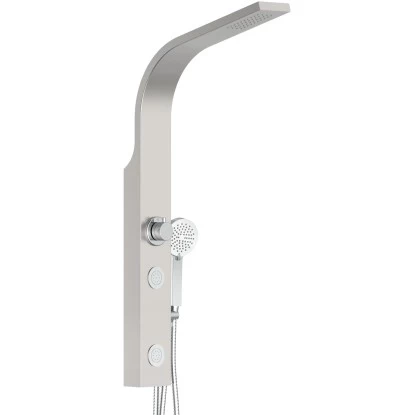 Das hochwertige Schütte Duschpaneel Sansibar aus Edelstahl ist in jedem Bad ein Hingucker und kann nebenbei auch mit tollen Funktionen überzeugen. Mit einer Kopf- und einer Handbrause sowie mit 2 Massagedüsen sorgt das Paneel für ein unvergessliches Duscherlebnis zum Entspannen und Wohlfühlen. Die Handbrause verfügt über 3 Strahlvarianten, wählen Sie je nach Wunsch zwischen dem Massagestrahl, dem Regenschauer und dem Kombistrahl. Mit Hilfe des integrierten Umstellers können sie ganz einfach zwischen den 3 Funktionen wechseln. Für eine schnelle und leichte Reinigung sind sowohl die Hand- als auch die Kopfbrause mit Antikalknoppen ausgestattet. Kalkrückstände haben hier keine Chance und können einfach mit dem Finger entfernt werden. Der Brauseschlauch sowie der Anschlussschlauch aus Edelstahl sind doppelt gewickelt und verfügen über einen Standard G 1/2 Anschluss. Dank strenger Qualitätskontrollen und hochwertigen Materialien wird eine hohe Sicherheit und beste Wasserqualität garantiert.