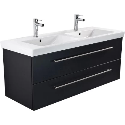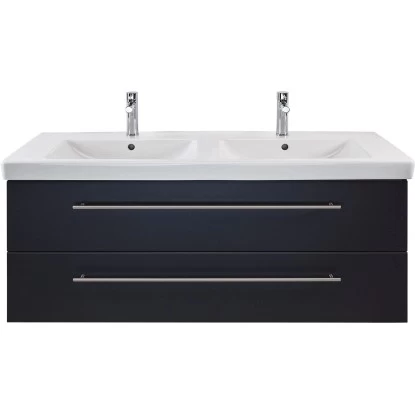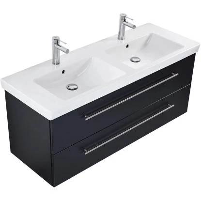 Das Badmöbel von Posseik in Anthrazit Seidenglanz überzeugt mit der Kombination eines hochwertigen Doppelwaschbeckens aus weißer Keramik von Villeroy & Boch.