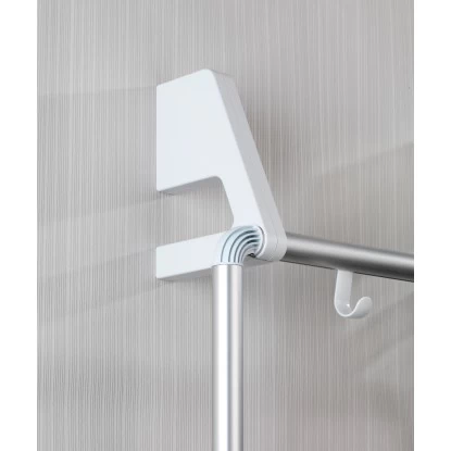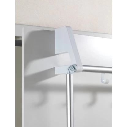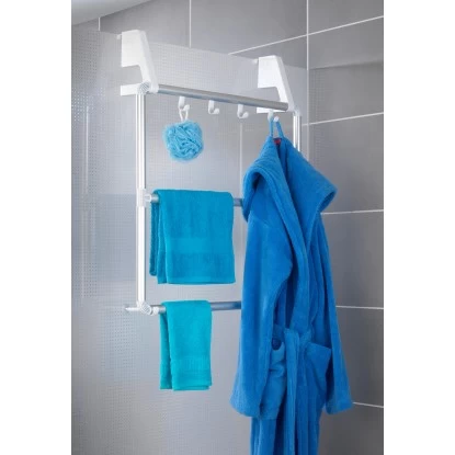 Auf 3 Garderobenstangen finden Handtücher oder Kleidungsstücke und an den 4 integrierten Haken Waschlappen oder Bad-Accessoires zusätzlichen Platz. Die Garderobe wird einfach über der Tür eingehängt. Die Hängevorrichtung passt auf alle gängigen Türbreiten und kann auch zur Befestigung an der Wand eingesetzt werden. Die Türen lassen sich trotz des eingehängten Handtuchhalters weiterhin problemlos schließen.