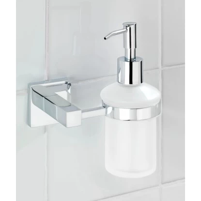 Der Power-Loc Seifenspender Duo aus der Serie San Remo besteht aus hochwertigem Messing, welches verchromt und 100 % rostfrei ist. Der abnehmbare Behälter des eleganten Pumpspenders ist aus satiniertem Glas gefertigt und eignet sich ideal zur Befestigung neben dem Waschbecken. Der Spender im kantigen Design bietet einen dekorativen Platz für Flüssigseife oder Waschlotion. Das macht den praktischen Seifenspender zu einem nützlichen Helfer im Bad oder Gäste-WC. Das Power-Loc-Klebesystem bietet dekorative Bad-Accessoires und Ablagen, die einfach – ohne Schrauben, Bohren oder Dübeln – an der Wand zu befestigen sind. Die Befestigungsserie Power-Loc zeichnet sich durch extrem festen Halt auf allen tragfähigen Oberflächen, z.B. Fliesen, Naturstein, Beton, Holz und vielen Kunststoffen, aus, auf denen professionelle Saugsysteme passen müssen. Durch den speziell entwickelten Klebstoff aus der Hightech-Forschung sind die Befestigungshaken jeweils dauerhaft hoch belastbar. Die Befestigungshaken lassen sich jederzeit wieder rückstandslos entfernen und können flexibel neu positioniert werden. Das Klebe-System hat sich bereits millionenfach in Industrie und Profi-Handwerk bewährt.