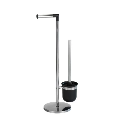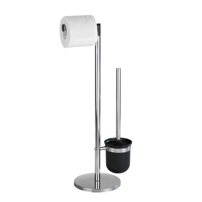 Die elegante Stand WC-Garnitur Parus aus hochwertigem, rostfreiem Edelstahl setzt dekorative Design-Akzente im Badezimmer. Sie ist eine 2 in 1 Kombination bestehend aus einem offenem WC-Bürstenhalter und einer Toilettenpapierrollenhalterung für die sofortige Entnahme. Für sichereren Stand sorgt der massive Standfuß. So werden Toilettenpapier und die WC-Bürste stets dekorativ griffbereit gehalten. Im Lieferumfang ist eine WC-Bürste mit schwarzem, auswechselbarem Bürstenkopf und Ø 8,5 cm enthalten.